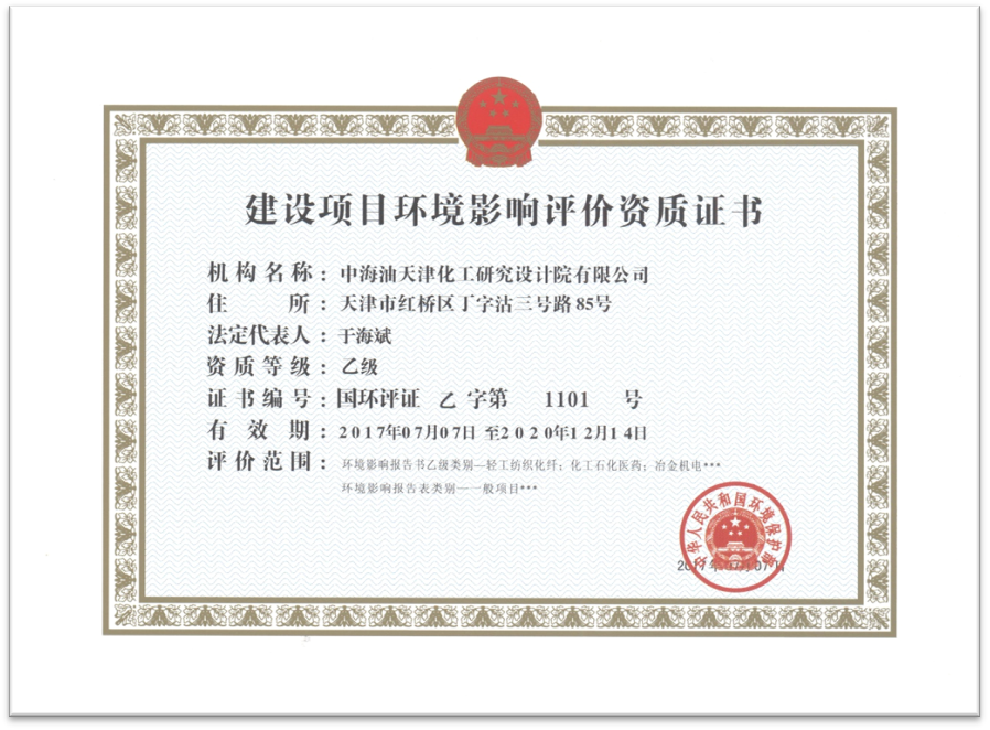 國(guó)家環(huán)境保護(hù)部頒發(fā)的環(huán)境影響評(píng)價(jià)乙級(jí)證書(shū)(國(guó)環(huán)評(píng)證乙字第1101號(hào))