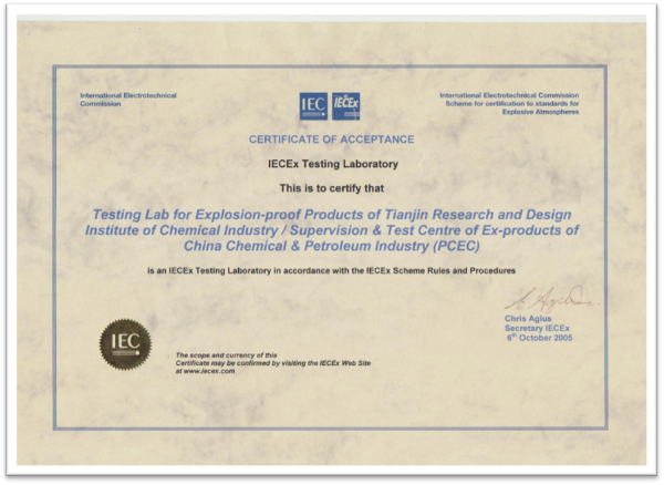 國家防爆產(chǎn)品質(zhì)量監(jiān)督檢驗(yàn)中心(天津)/石油和化學(xué)工業(yè)電氣產(chǎn)品防爆質(zhì)量監(jiān)督檢驗(yàn)中心(簡稱PCEC)于 1985年經(jīng)原國家勞動(dòng)部和化學(xué)工業(yè)部批準(zhǔn)成立。主要從事特殊環(huán)境(易燃易爆、化學(xué)腐蝕、海洋深水、高溫極寒等)設(shè)備安全檢測及技術(shù)研究、國內(nèi)及國際防爆認(rèn)證、生產(chǎn)許可檢驗(yàn)、監(jiān)督抽查檢驗(yàn)、仲裁檢驗(yàn)、船用產(chǎn)品型式試驗(yàn)、安全生產(chǎn)檢測檢驗(yàn),在用防爆設(shè)備全生命周期安全管理咨詢、防爆設(shè)備完整性管理咨詢、防爆工程設(shè)備監(jiān)理服務(wù)及防爆培訓(xùn)技術(shù)咨詢等。